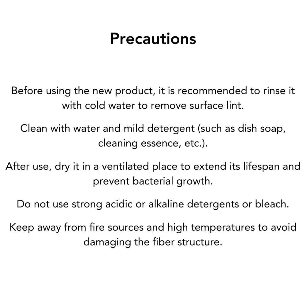 Rinse with cold water before first use to remove surface lint. Clean with water and mild detergent (e.g., dish soap). Air-dry in a ventilated area after use to extend lifespan. Avoid strong acidic or alkaline detergents and bleach. Keep away from fire sources and high temperatures to prevent fiber damage.Features