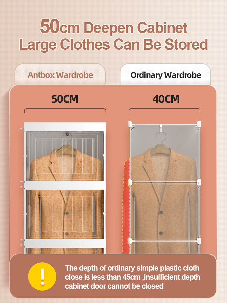 ANTBOX core patent QuickFold technology utilizes a multi-module integrated folding design structure to achieve rapid expansion and folding effect, 3-minute sequential assembly, bid farewell to complex steps. Easy storage in three steps, good partner for renting, say goodbye to the disposable wardrobe. Exclusive M-shaped cabinet door design, bright surface + frosted double material, simple and clean color, purify your eyes. Strengthen the double-layer door panel, strengthen thickening without deformation, strong magnetic self-priming cabinet door, strengthen the tightness of the wardrobe/shoebox. Dustproof treatment on the surface of the door panel can reduce dust adsorption. Zero formaldehyde, healthy and environmentally friendly, PP material cabinet, safe and non-toxic, more assured. More specifications to meet the needs of multiple scenarios, the best storage choice for the younger generation. Lazy storage is born from simplicity.