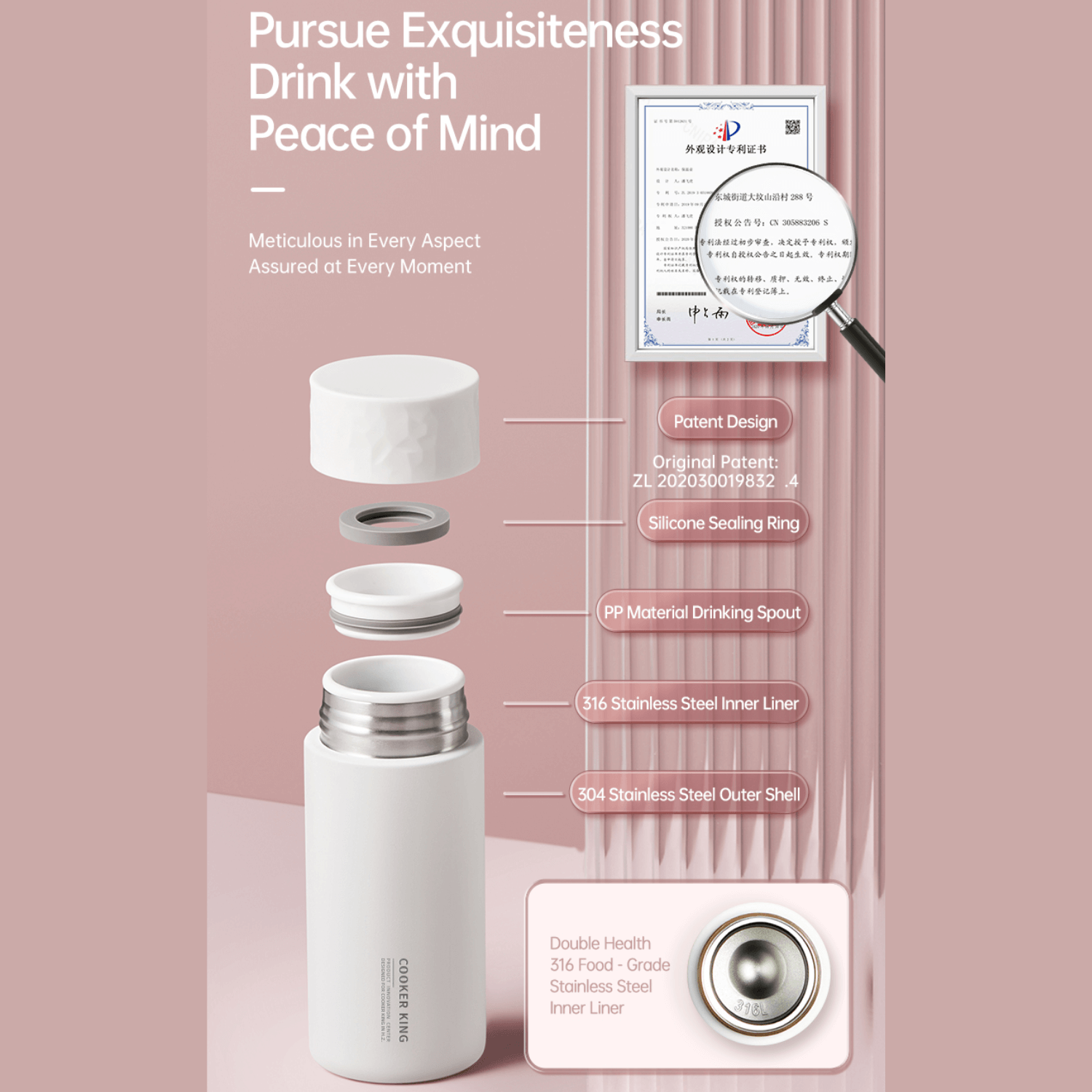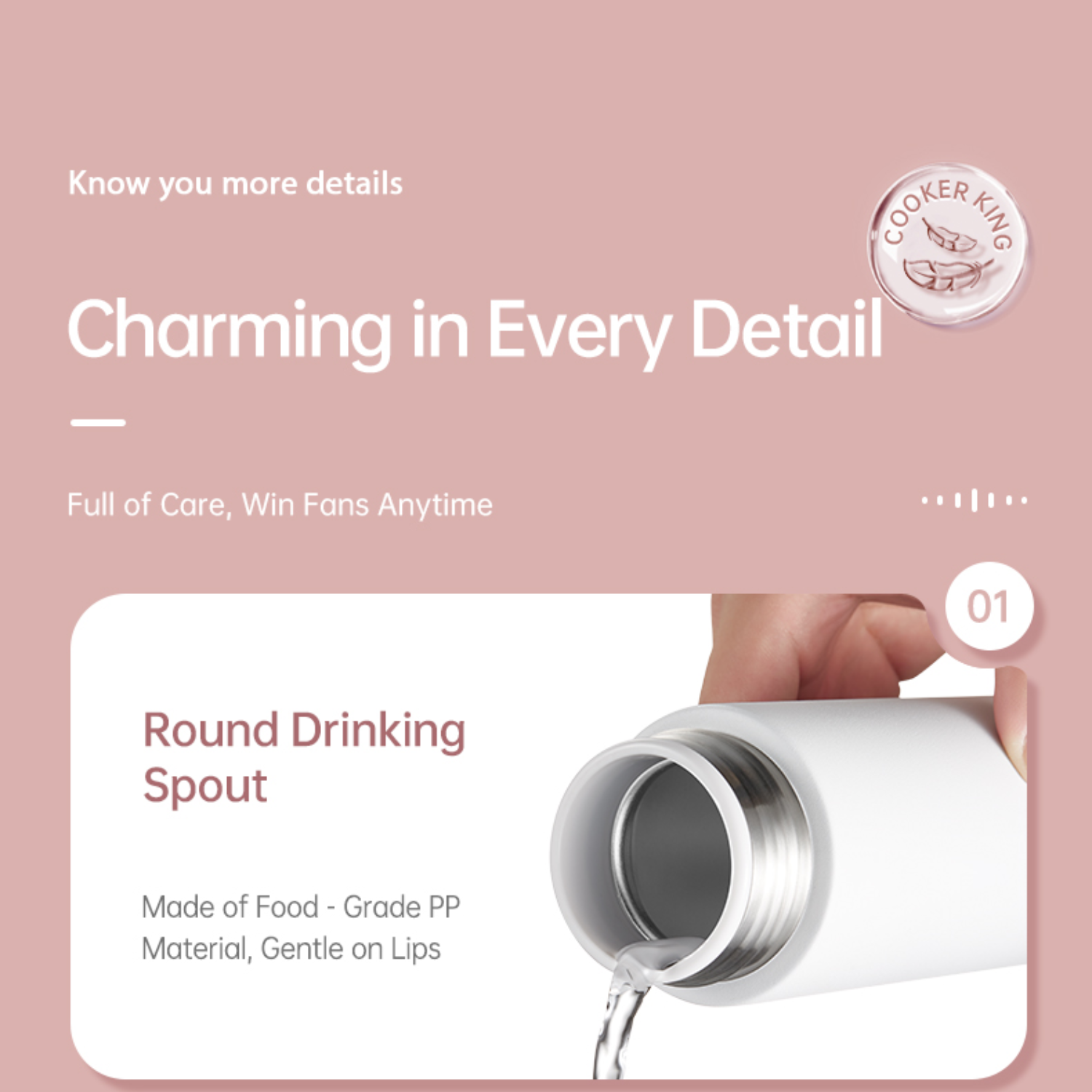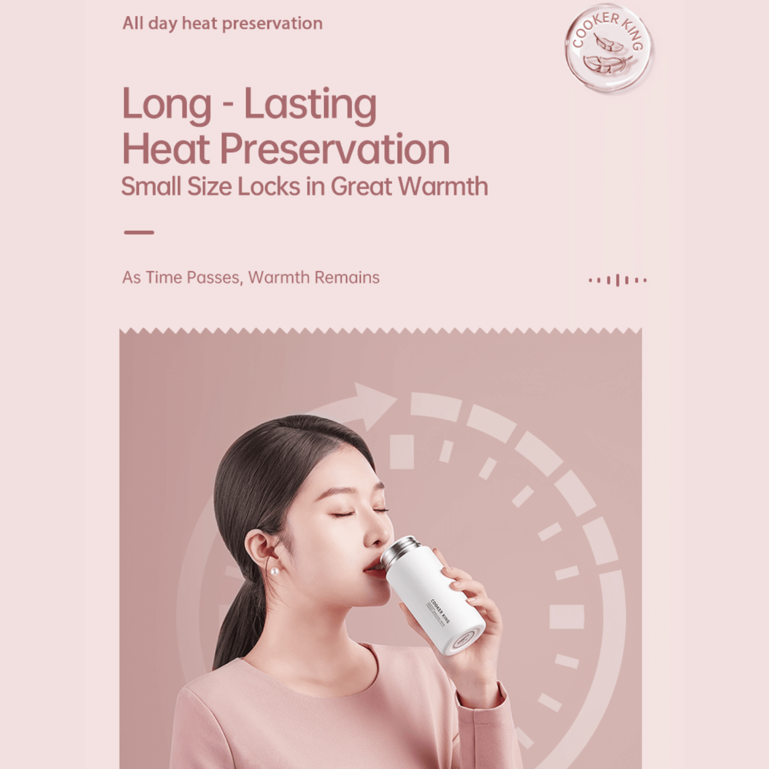 The Cooker King Estee Thermos Cup uses 316 stainless steel for inner liner and 304 stainless steel for outer shell which offer the safe and all day heat for your drinking routine. It is able to keep water warm for more than 12 hours. The trendy design could also contribute to your life story, catch both of hydration and attention.