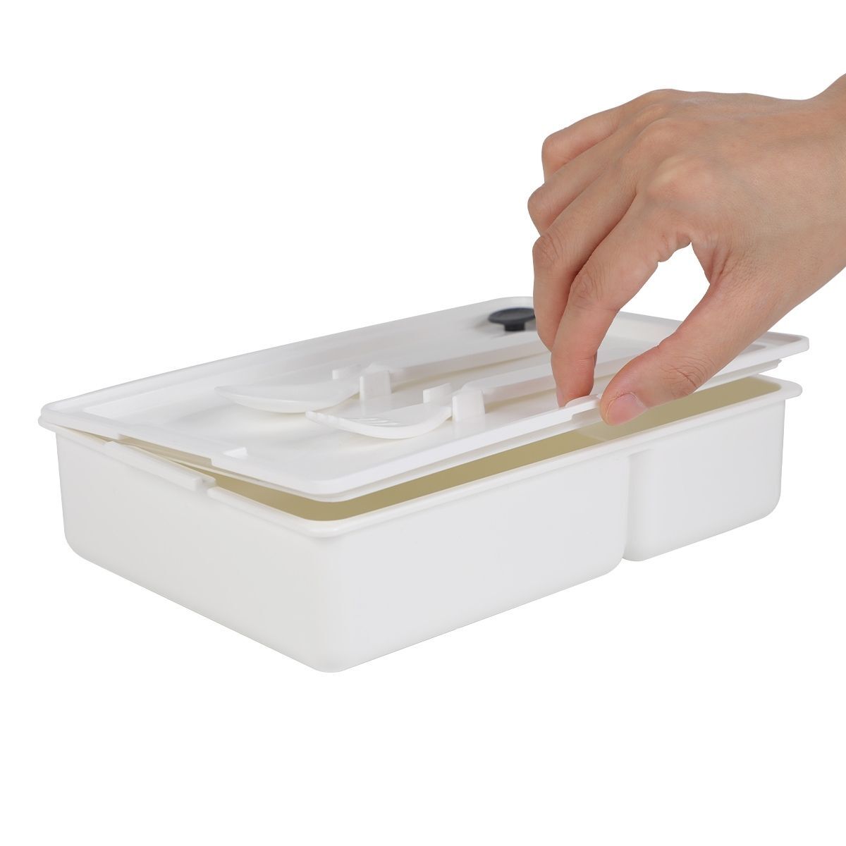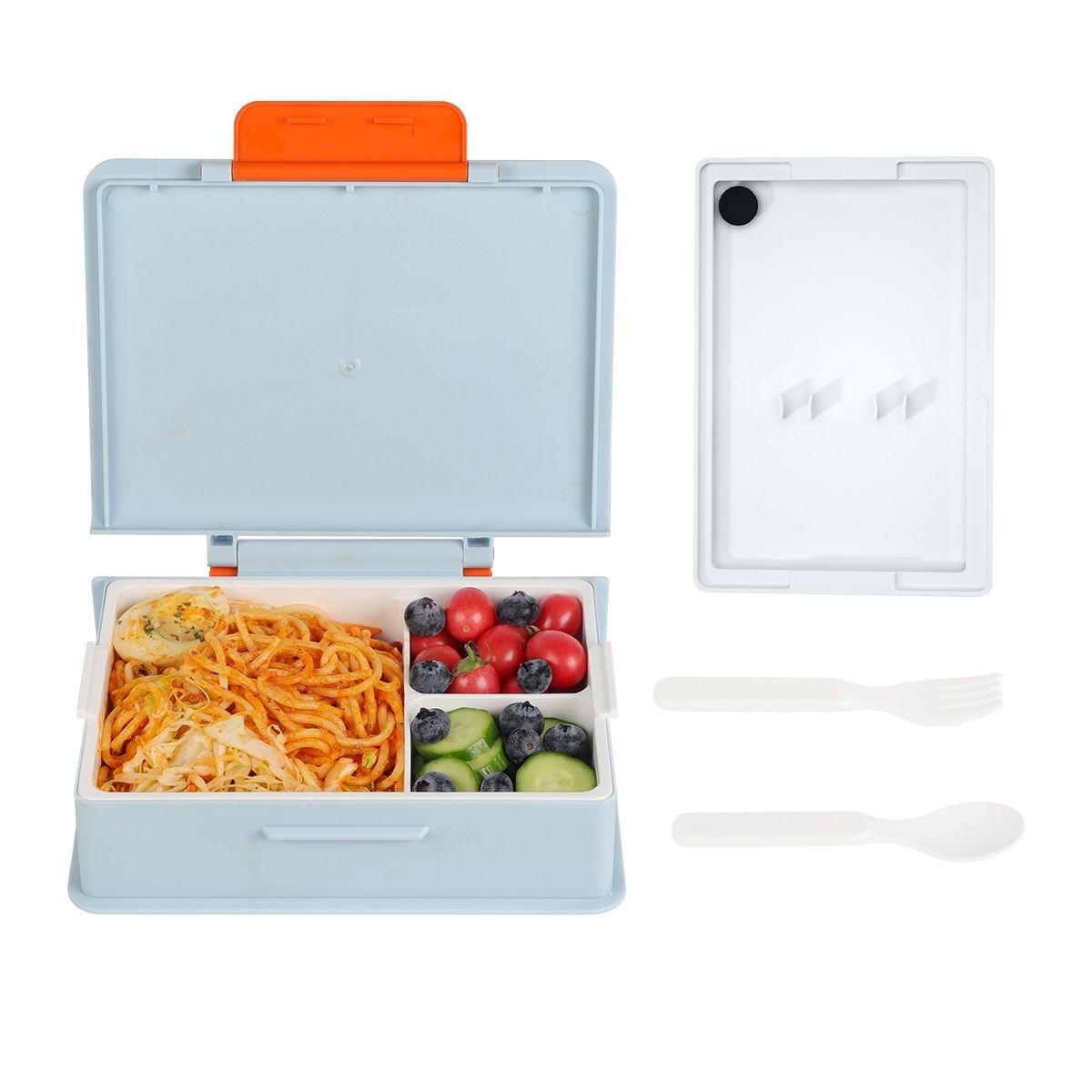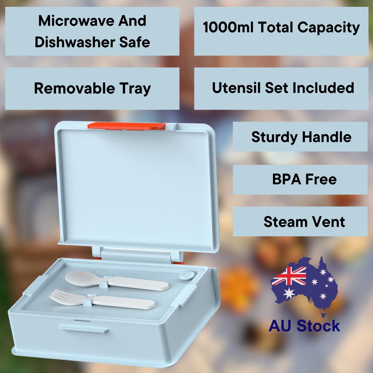 Included with the box is a set of plastic utensils, providing convenience for enjoying your meals. With a generous 1000ml capacity, it accommodates satisfying portions of food. The addition of a carry handle makes it easy to transport wherever you go.