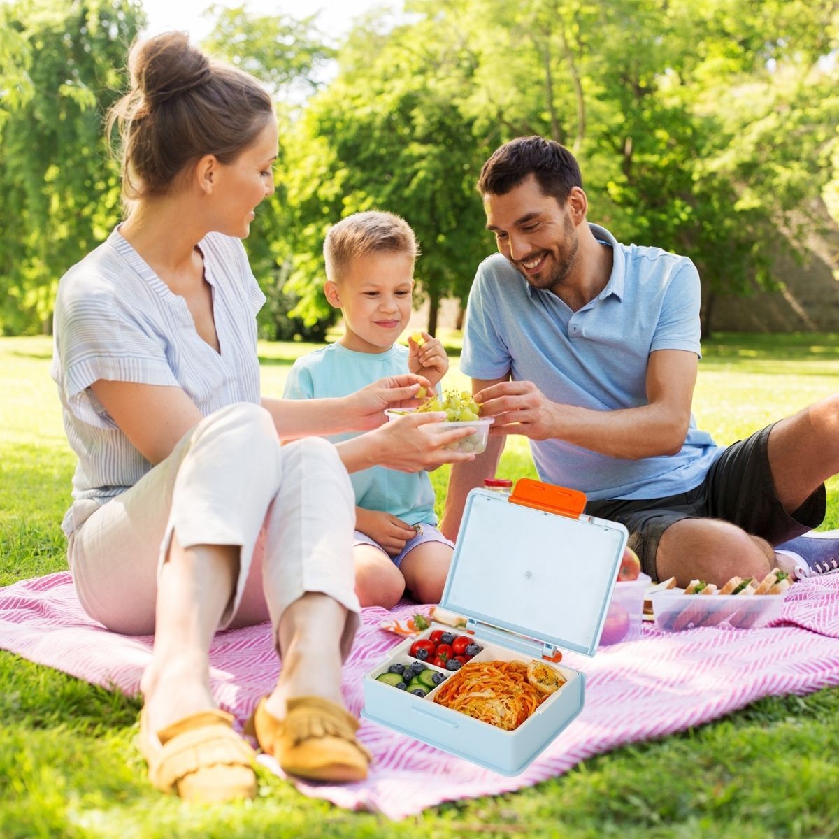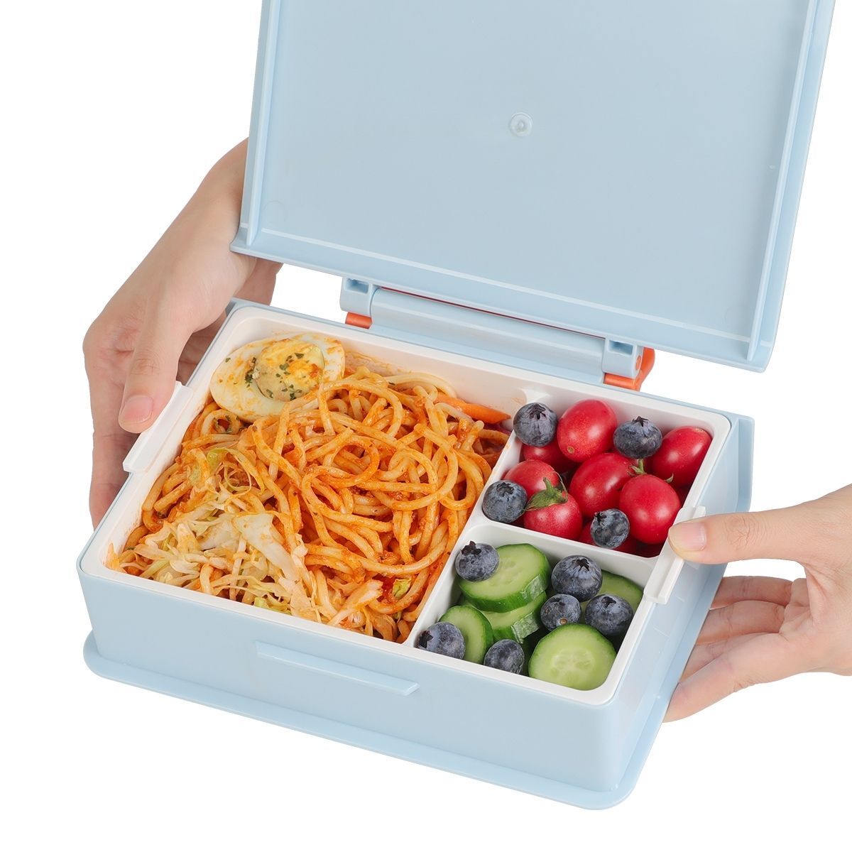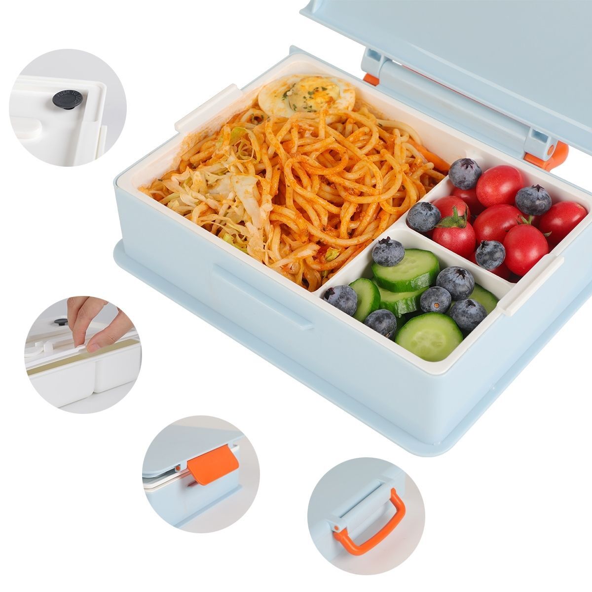 Included with the box is a set of plastic utensils, providing convenience for enjoying your meals. With a generous 1000ml capacity, it accommodates satisfying portions of food. The addition of a carry handle makes it easy to transport wherever you go.