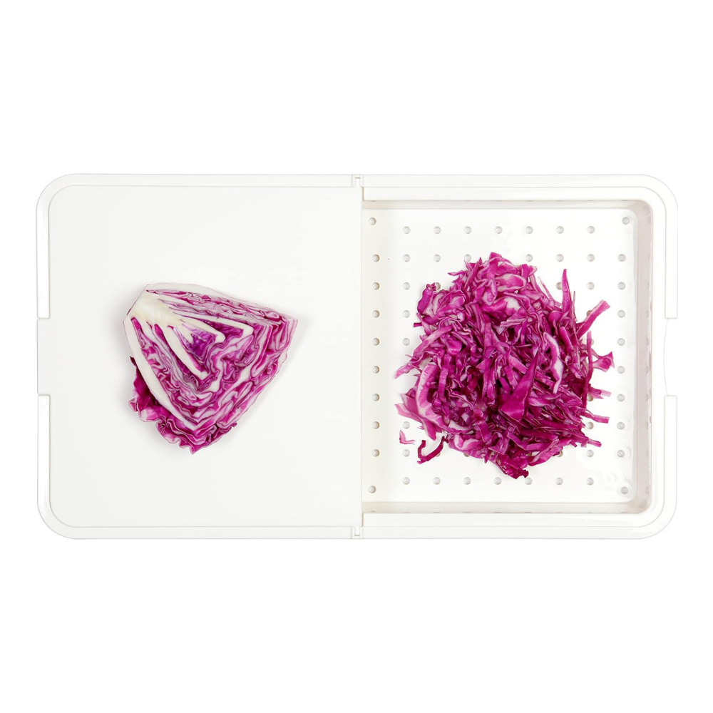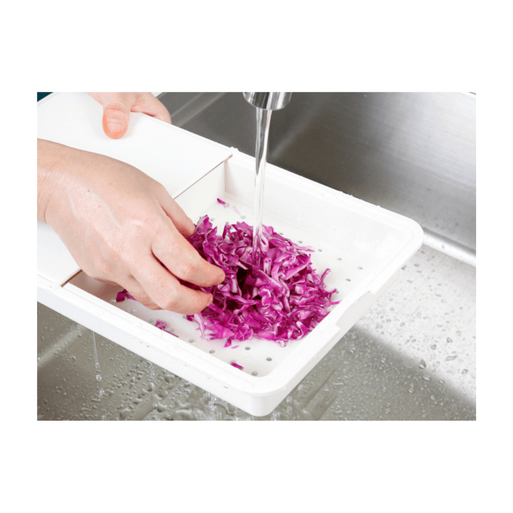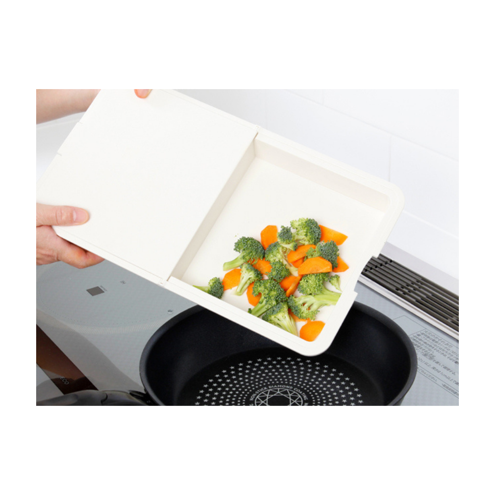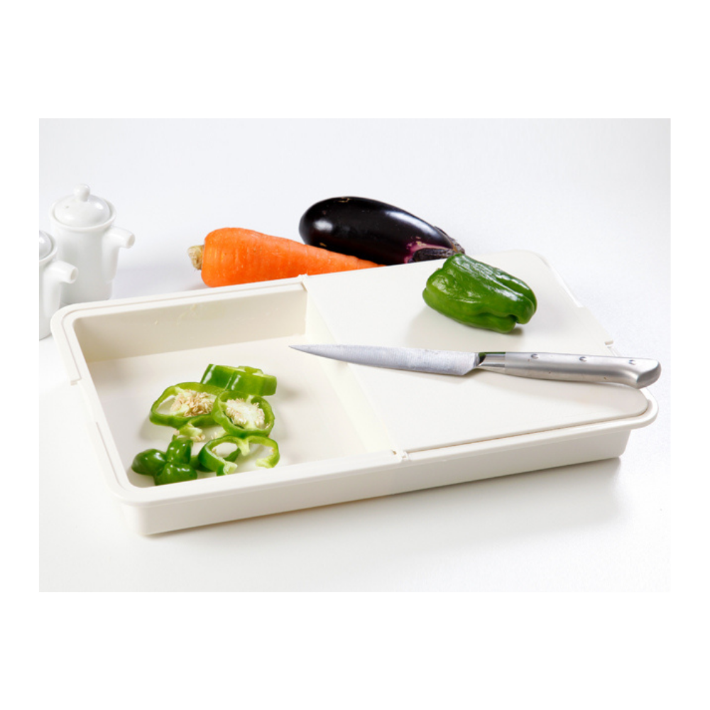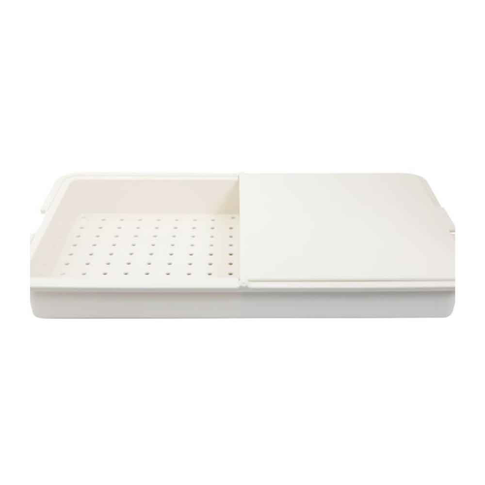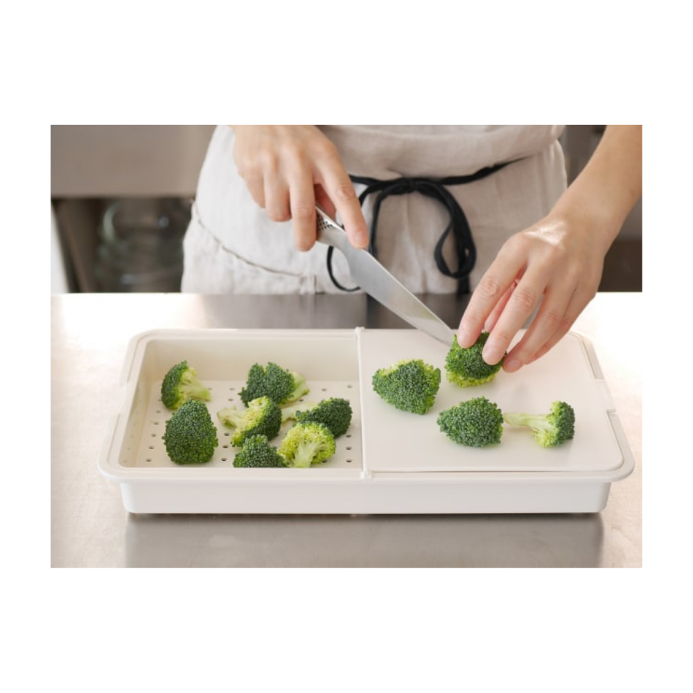 The Ihara Kihan Natural Cut & Tray - Ivory is a convenient cutting board with a tray that allows you to use your kitchen space effectively. You can place cut ingredients on the tray and carry them around. A colander is on one side, so you can drain food that has been dropped into the colander. The cutting board, bowl, and colander are integrated, making it perfect for everyday use in the kitchen