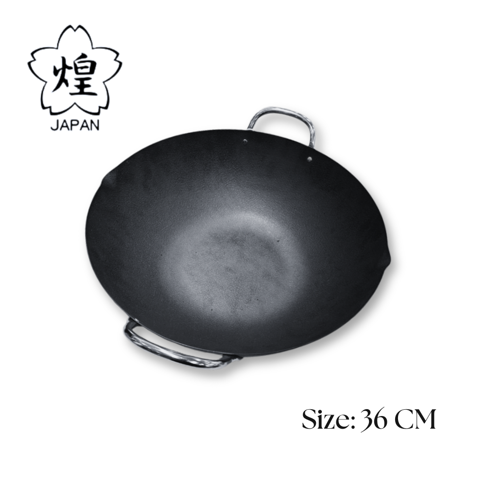 Introducing the Kirameki Nitriding Processing Double Handle Wok 36cm - 77414 by Hello Kitchen. This premium cast iron wok, proudly made in Japan, combines innovative nitriding processing with a convenient double handle design. Crafted with meticulous attention to detail, this 36cm wok delivers exceptional heat distribution and durability for a superior cooking experience. Embrace the art of stir-frying with precision and style using this Kirameki wok.