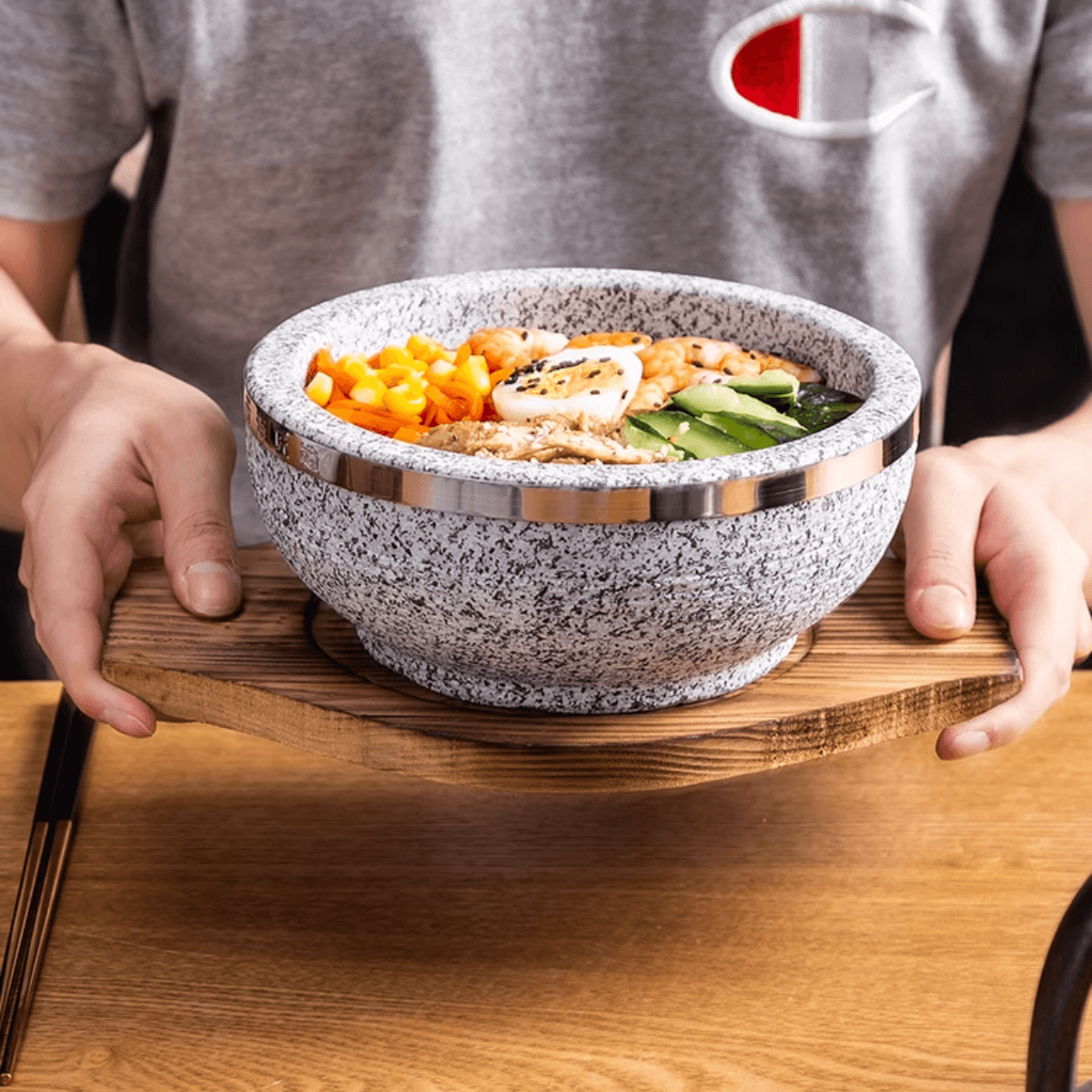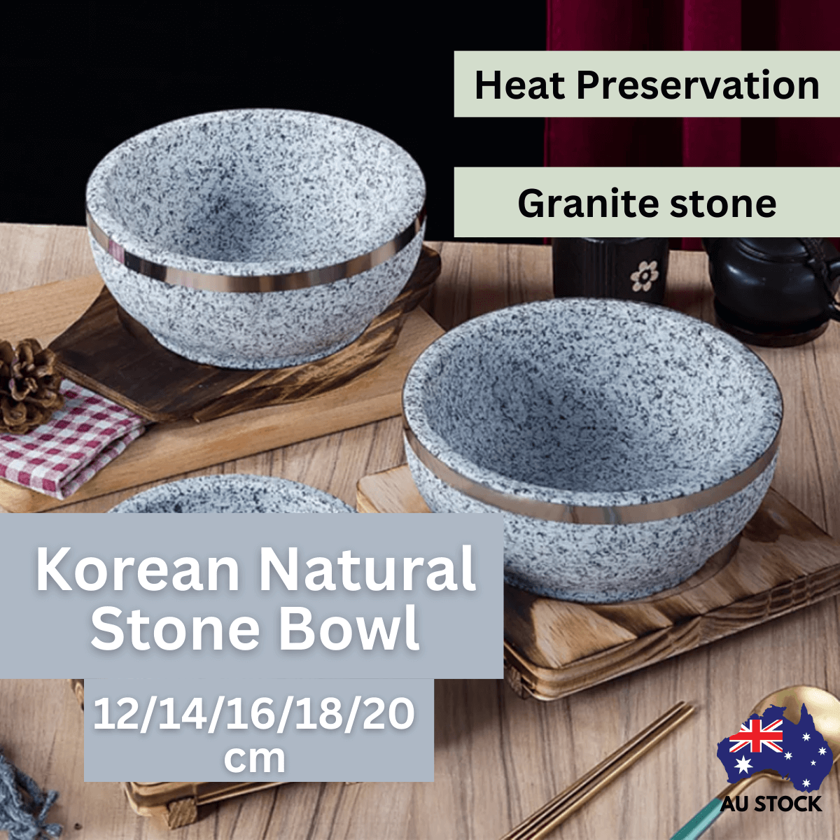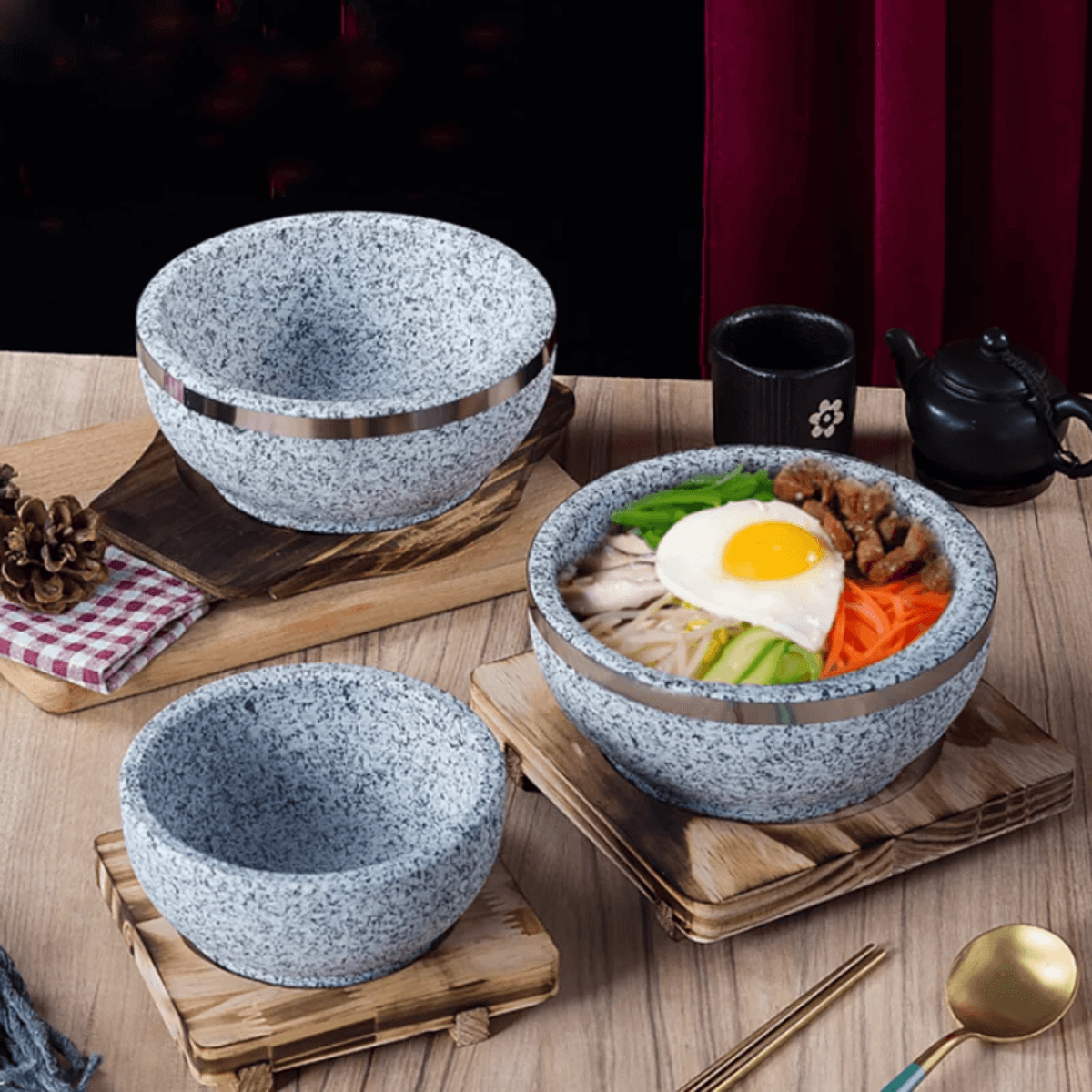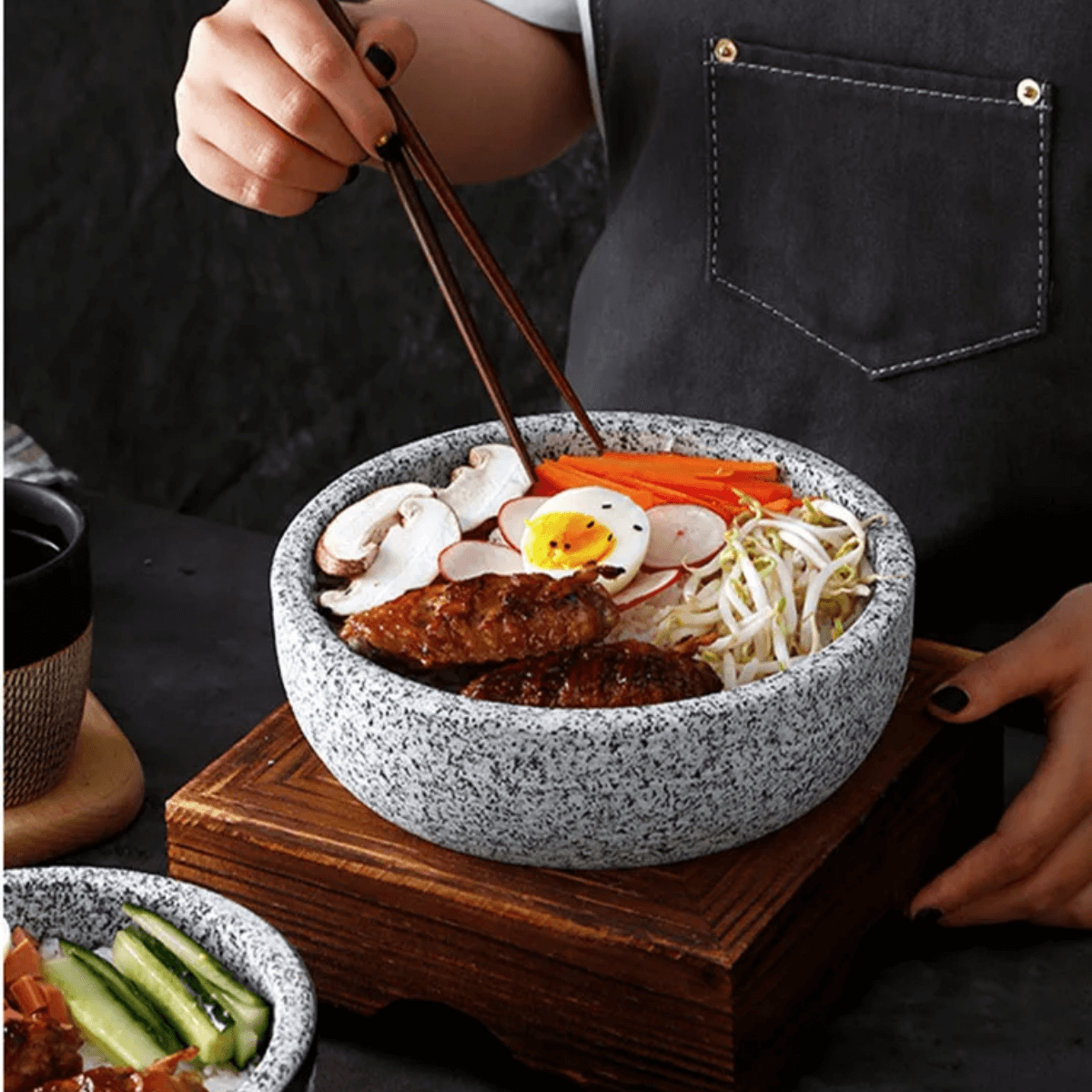 The natural Korean stone bowl used for bibimbap offers excellent heat retention, stability and ease of cleaning. It withstands extreme temperatures, keeping the dish warm and original, providing a reliable cooking experience for this traditional Korean dish".