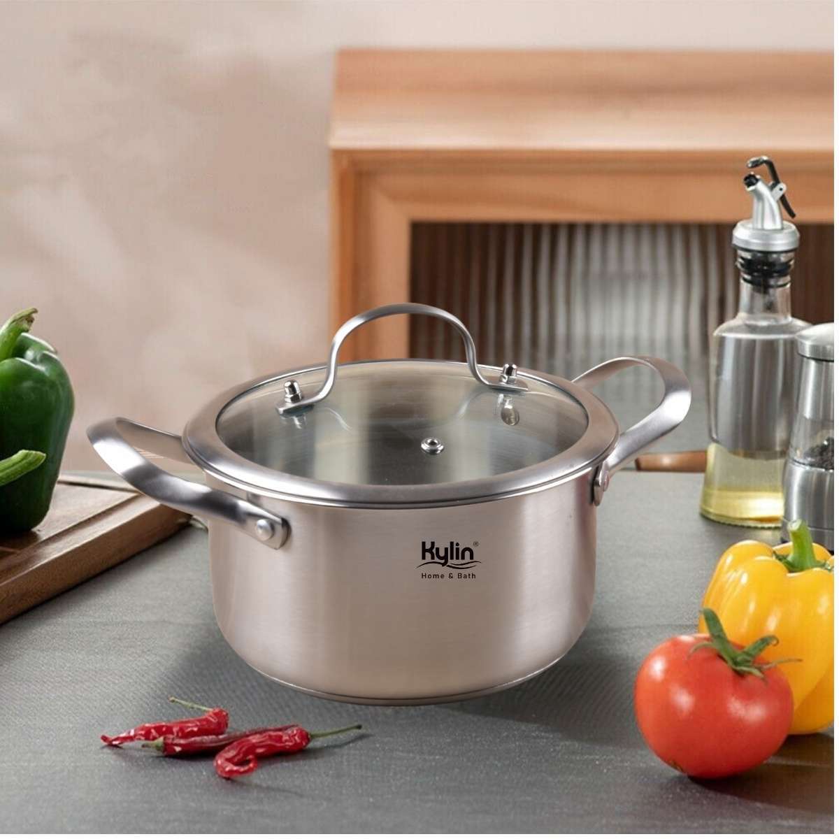The Kylin 304 Soup pot 26CM is a versatile kitchen essential for perfect braising, baking, simmering and slow cooking. Made from high quality 304 stainless steel and a reinforced solid aluminium 430 stainless steel base, this saucepan is of first class craftsmanship. Compatible with all hobs including induction and suitable for any kitchen environment. The sturdy and secure design ensures durability and longevity, while the glass lid makes it easy to monitor cooking progress. Whether you're preparing a hearty stew or a delicious slow cooker, this crockpot is up to the task. Its stainless steel construction ensures even heat distribution, induction compatibility provides efficient cooking, and its generous 26cm size provides plenty of space to cook your favourite dishes. Equipped with two carrying handles, the pot is easy to lift or carry, even when full, so cooks can handle more food during busy service periods.