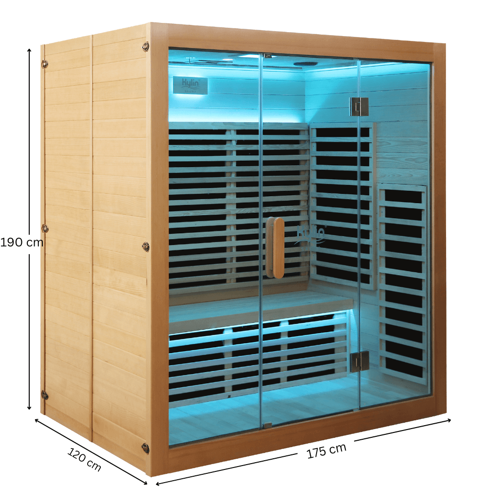 Elevate your wellness experience with the Kylin Carbon Infrared Sauna Room, designed for up to four people. The HL-400K model is crafted from high-quality Canadian Hemlock wood and features efficient carbon heating technology, delivering a deeply relaxing infrared sauna session. Its spacious design includes color therapy with vibrant light stripes, enhancing your mood during your sauna experience. With Bluetooth connectivity, you can play your favorite tunes through the two built-in speakers. The full glass door adds a touch of modern elegance, making this sauna a luxurious retreat for your home.