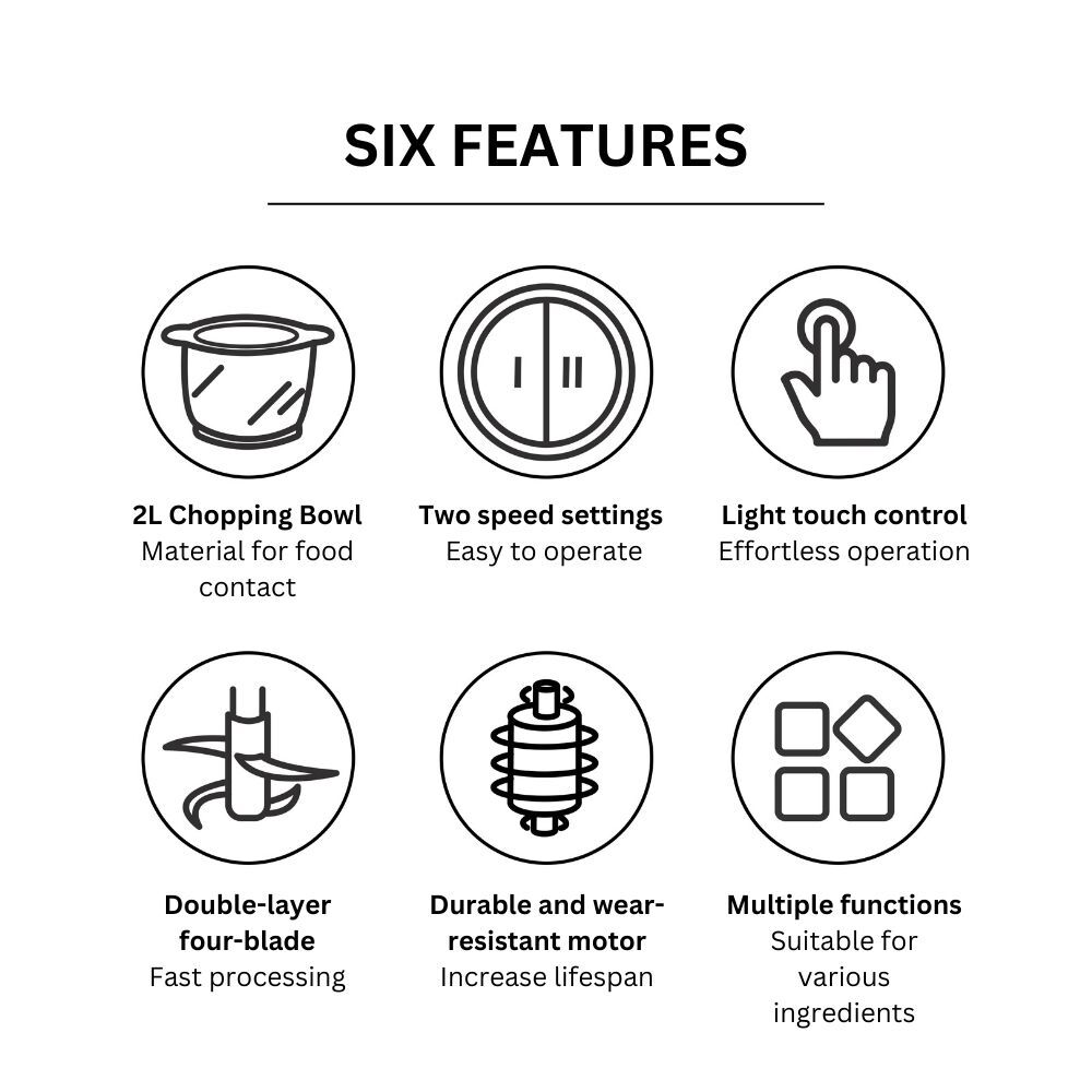 - 2L Glass Bowl: Durable and clear for easy visibility while chopping within a large capacity.