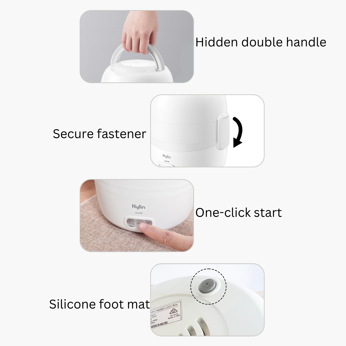The Kylin Electric Heated Lunch Box features a double-layered design with a detachable egg steamer, providing ample meal capacity. It is constructed with a stainless steel food container and includes a convenient lunch bag for easy portability and storage.