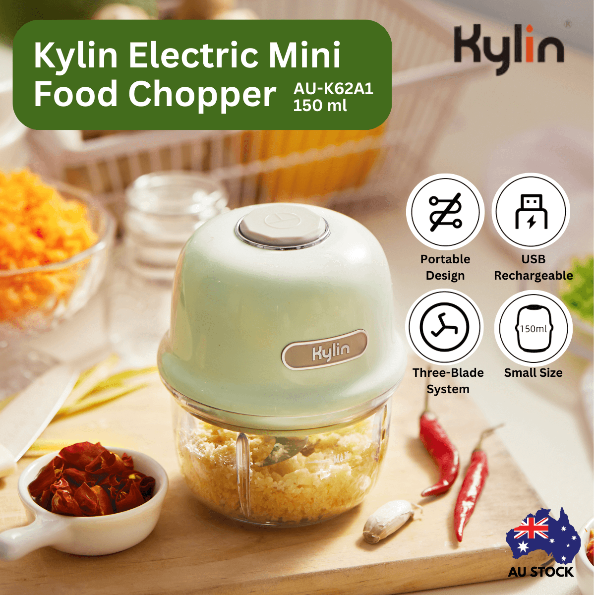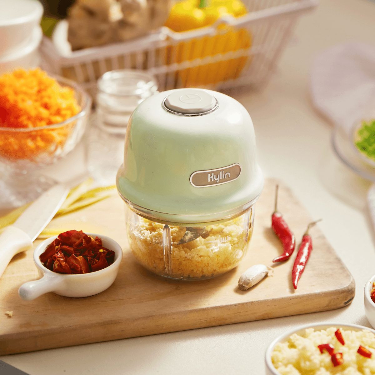The Kylin Electric Mini Food Chopper is a portable and wireless kitchen companion. With USB rechargeability, it features a robust stainless steel three-blade system in a compact size, capable of efficiently chopping various types of food for convenient and versatile meal preparation.