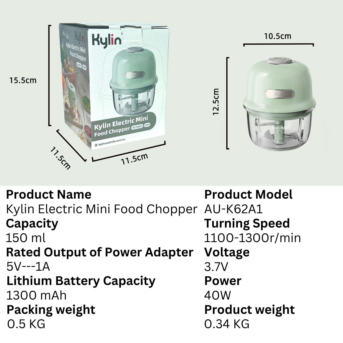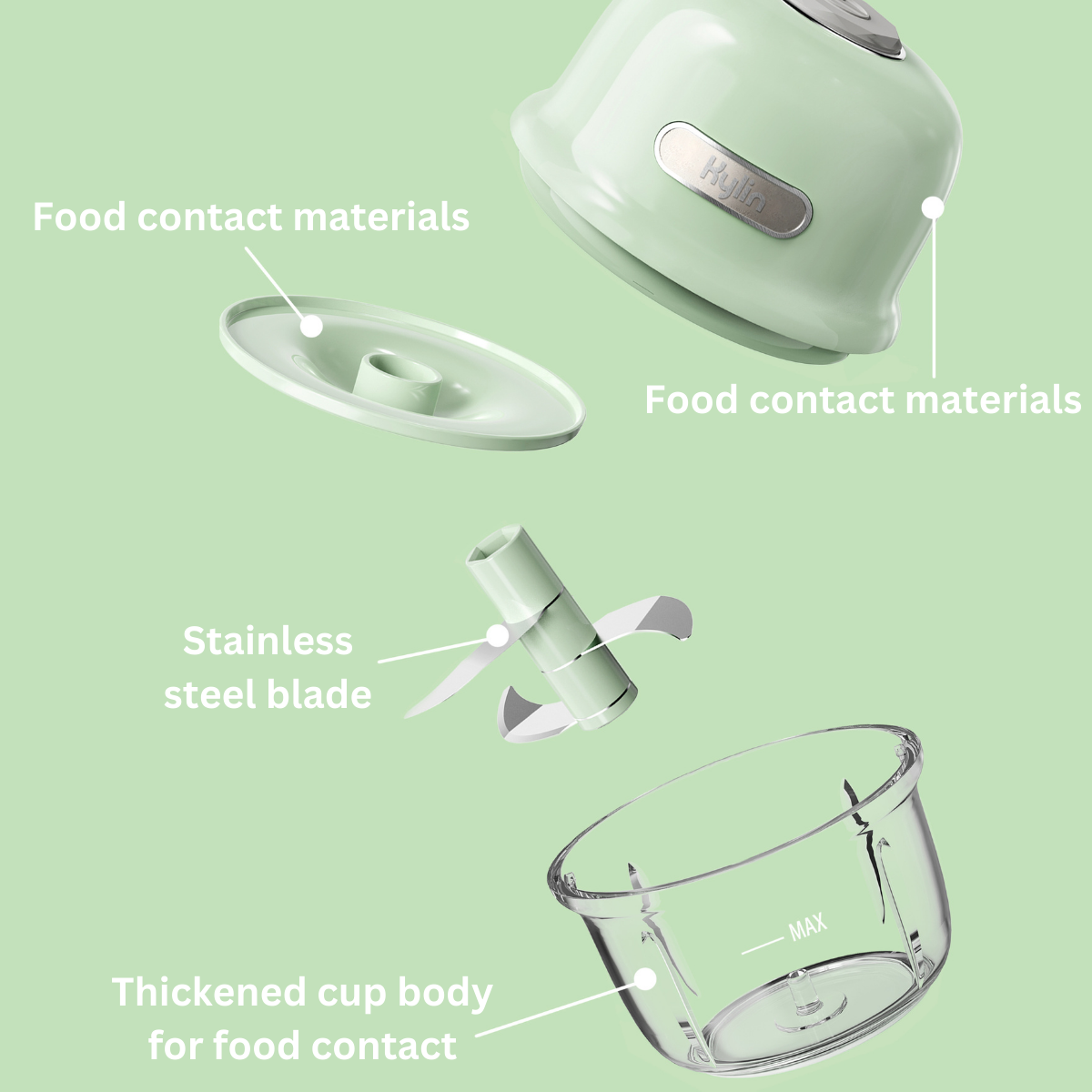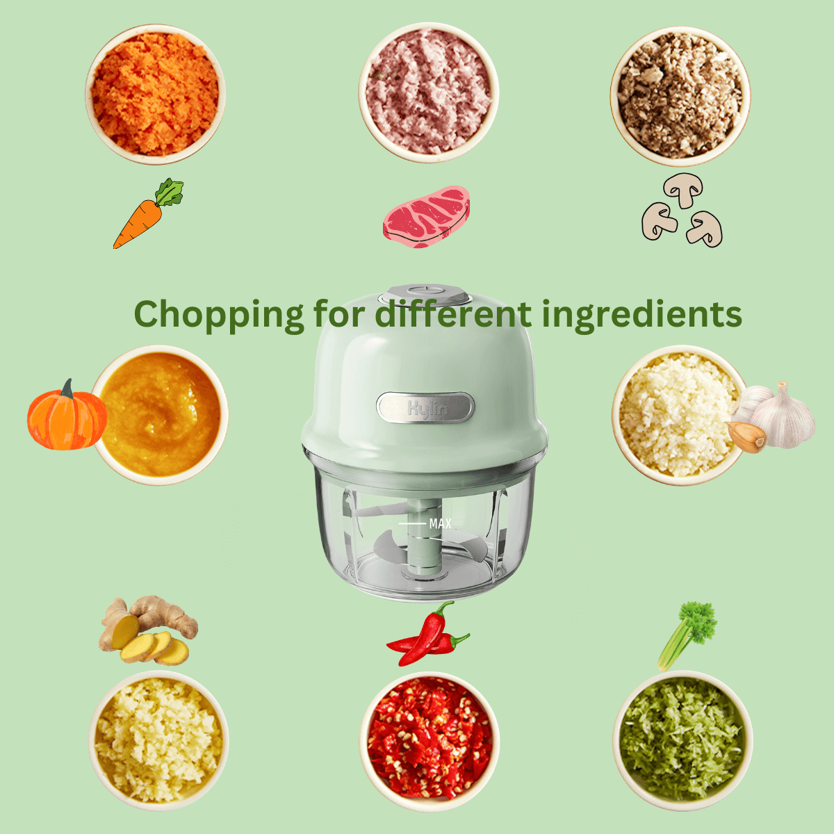 Kylin Electric Mini Food Chopper: Portable, USB rechargeable, three-blade system, compact size, efficiently chops various foods for convenient and versatile meal prep.