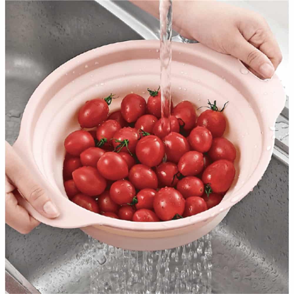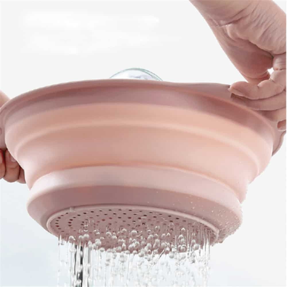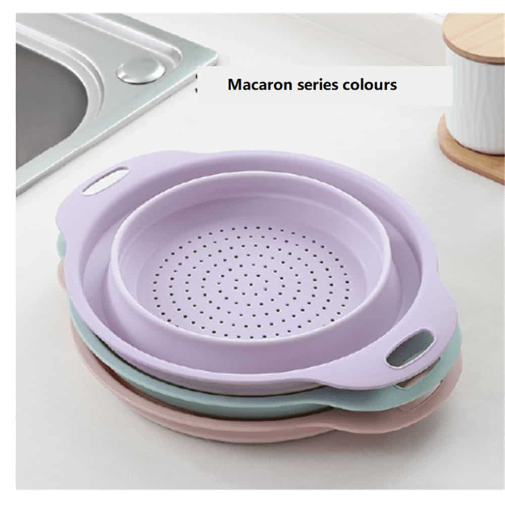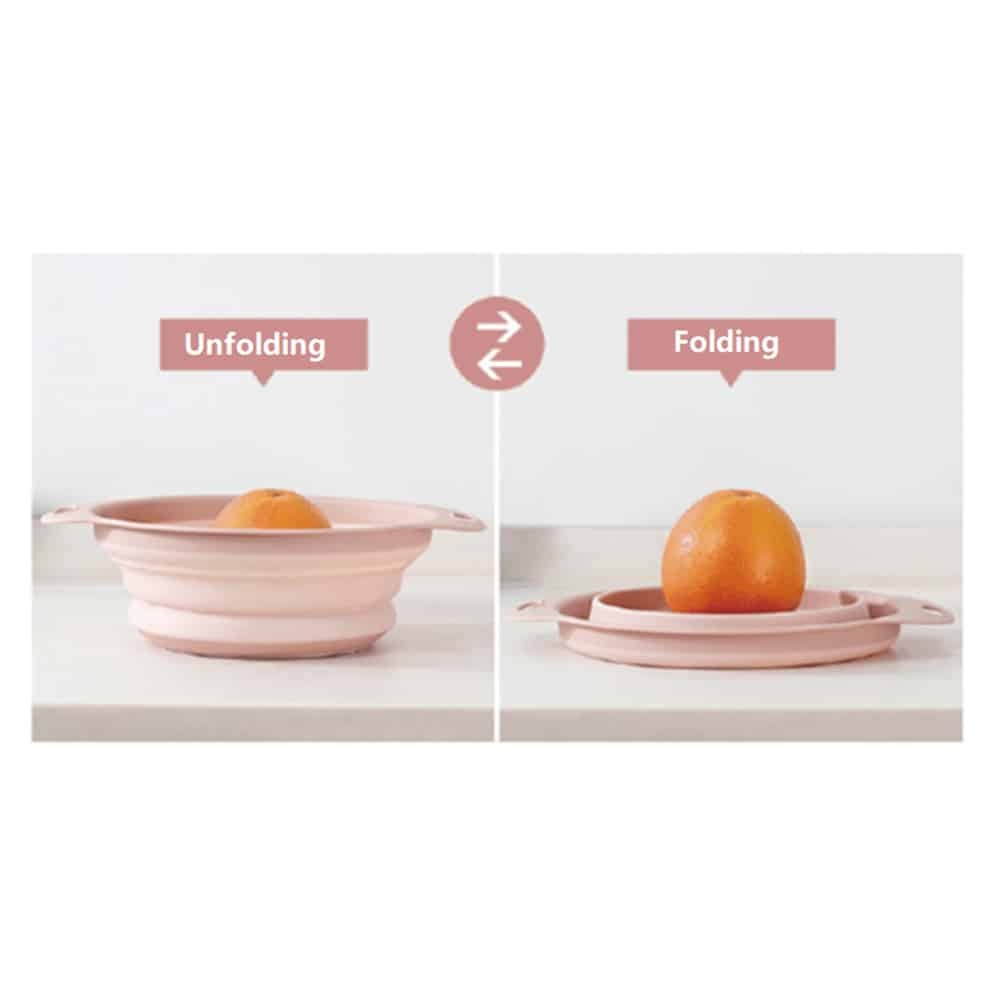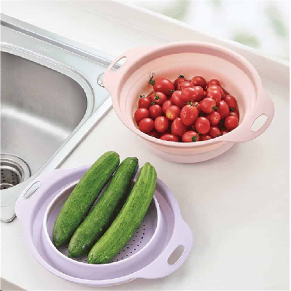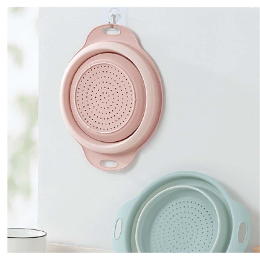 - Foldable with a space-saving design, kitchen cabinet friendly, stores easily in small kitchen spaces, and takes less than 1/4 the space of a traditional colander. Can be hung on a hook using one of the side handles.