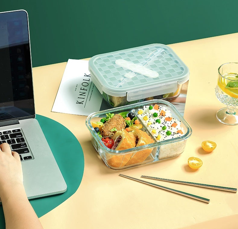 This food storage container is made of high-temperature resistant glass, and it comes with a snap-lock lid. The 3 compartments are divided by glass dividers, which is perfect for keeping food separate until mealtime. With thermal conductivity, this container is not easy to be very hot after microwave heating. With low sodium oxide content, the product remains bright as new despite long-term use. There are 2 colors available for the glass lunch box