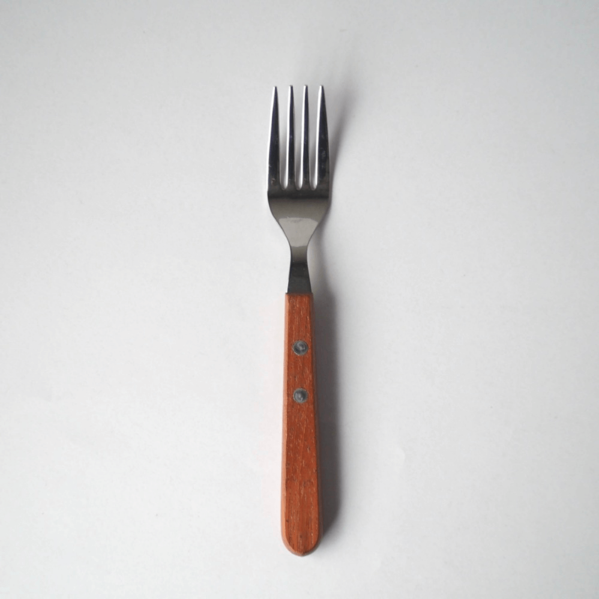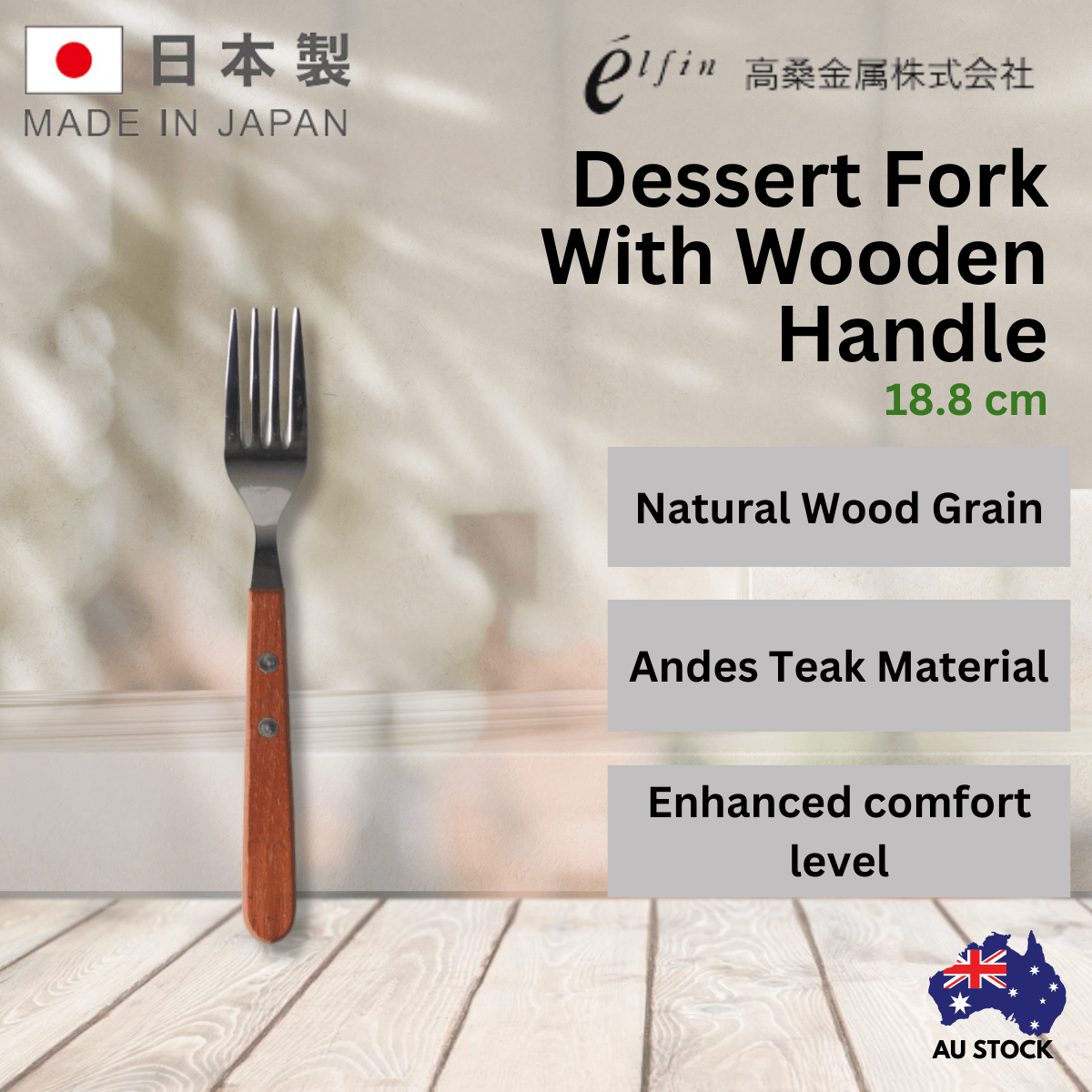 Takakuwa Dessert Fork with Wooden Handle highlights Andes Teak's unique colours, featuring natural wood grain, secured with two screws. Not dishwasher safe.