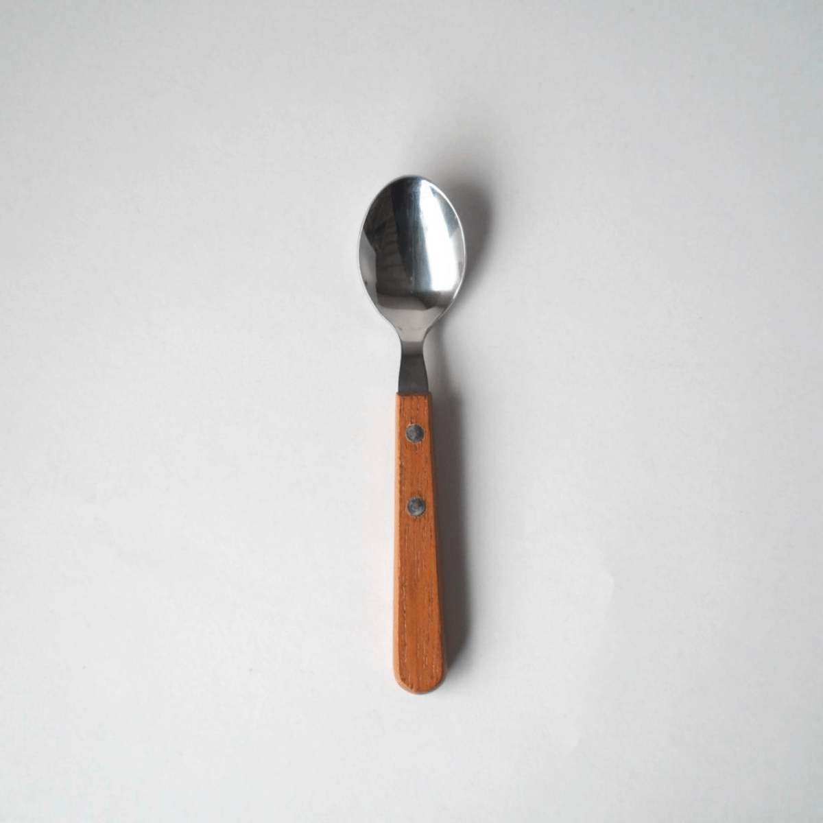 Dessert Spoon With Wooden Handle. Andes Teak wood, known for its blend of colours, adorns this cutlery. The beautiful grain of natural wood is highlighted, gaining familiarity and a unique texture with use. Secured with two screws, it's not suitable for dishwasher cleaning.