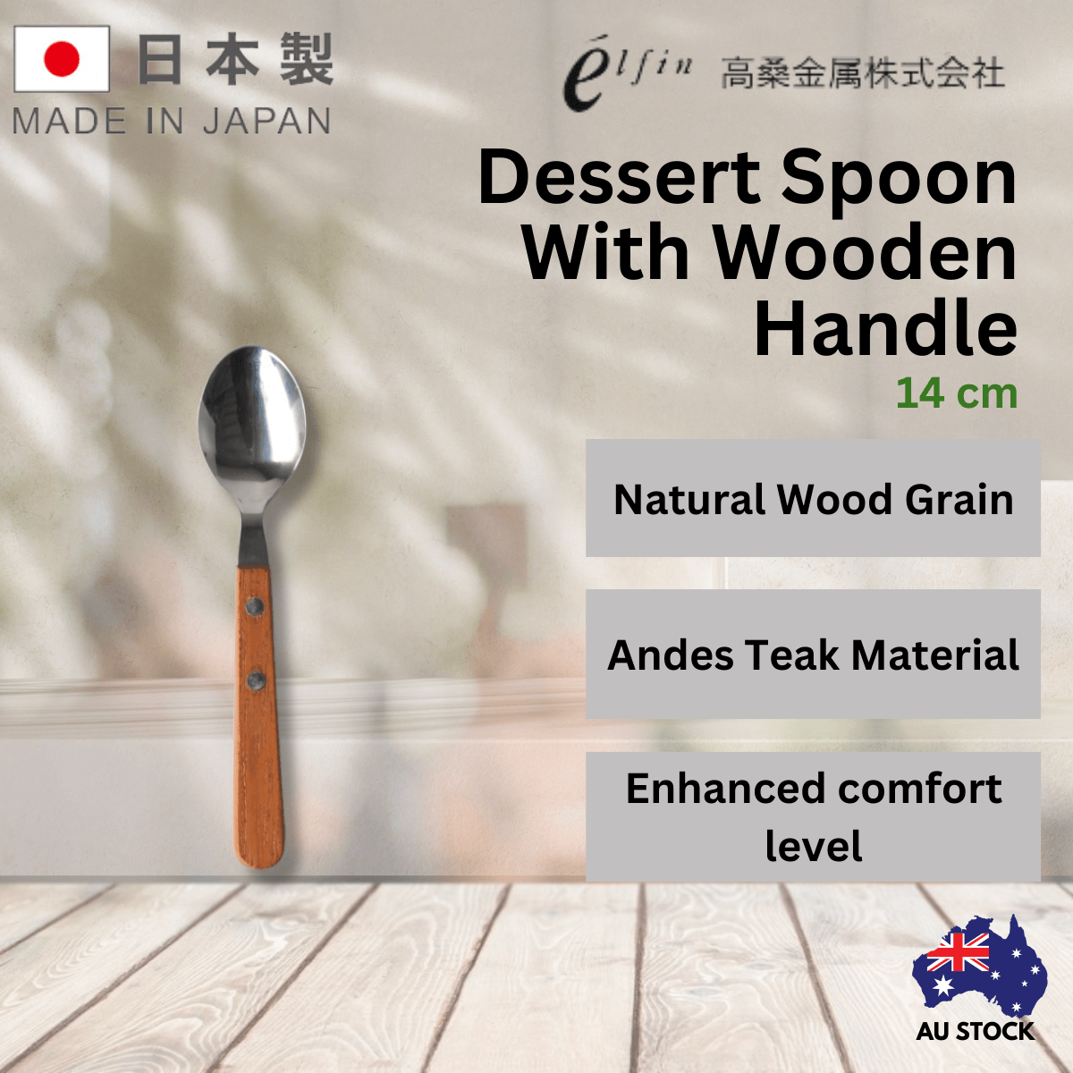 Takakuwa Dessert Spoon with Wooden Handle highlights Andes Teak's unique colours, featuring natural wood grain, secured with two screws. Not dishwasher safe.