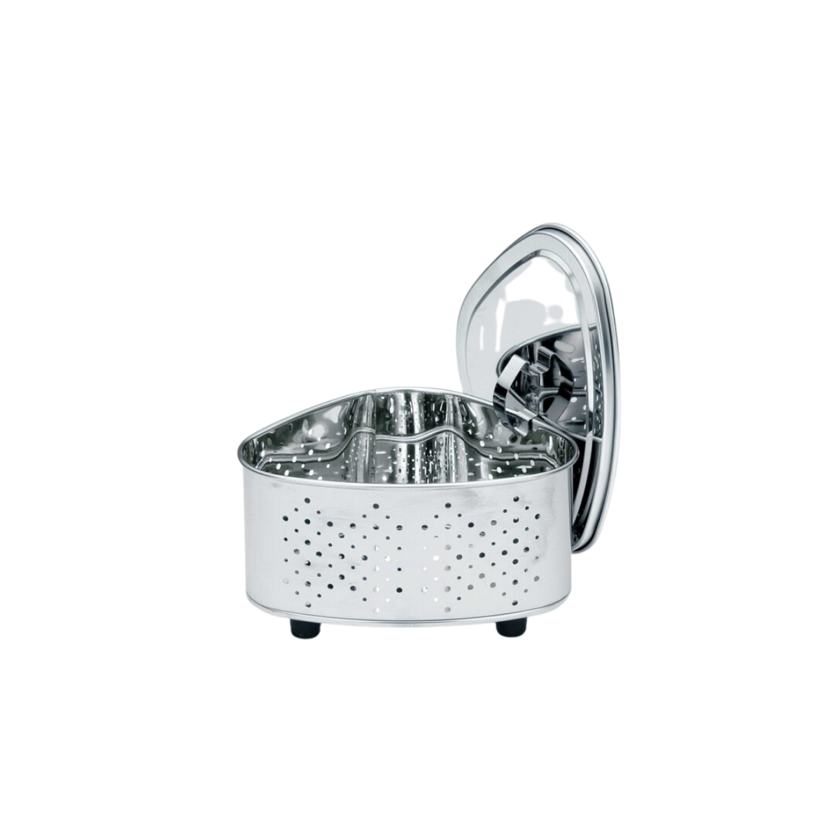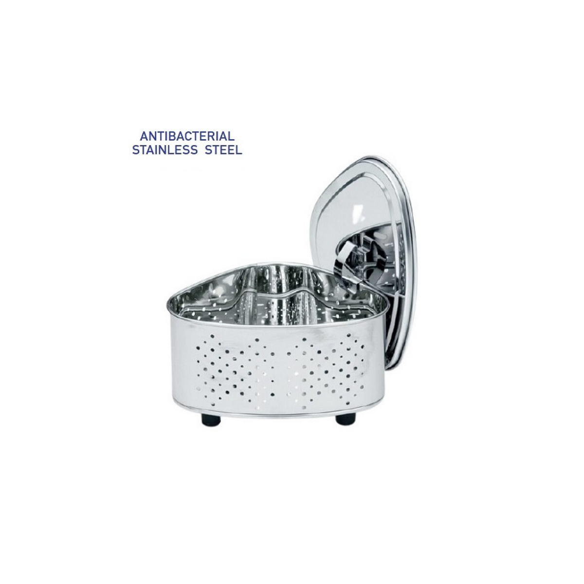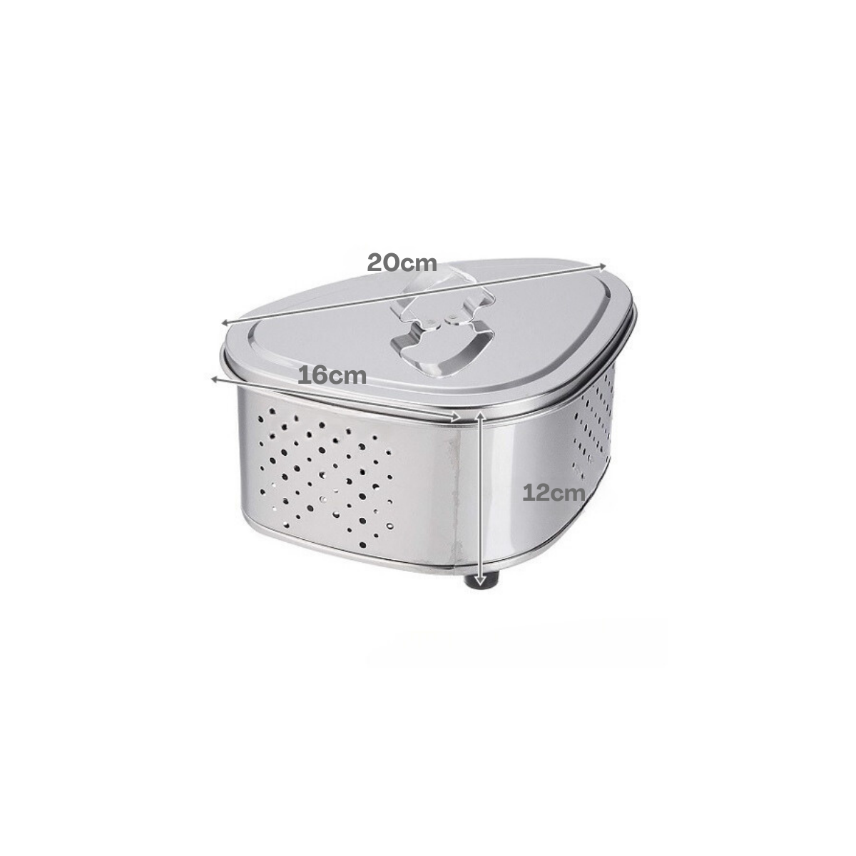 Antibacterial Stainless Steel Triangle Corner with Lid for hygienic waste disposal. The lid minimizes odours, and hooks conveniently during use. Easy-to-clean stainless steel.