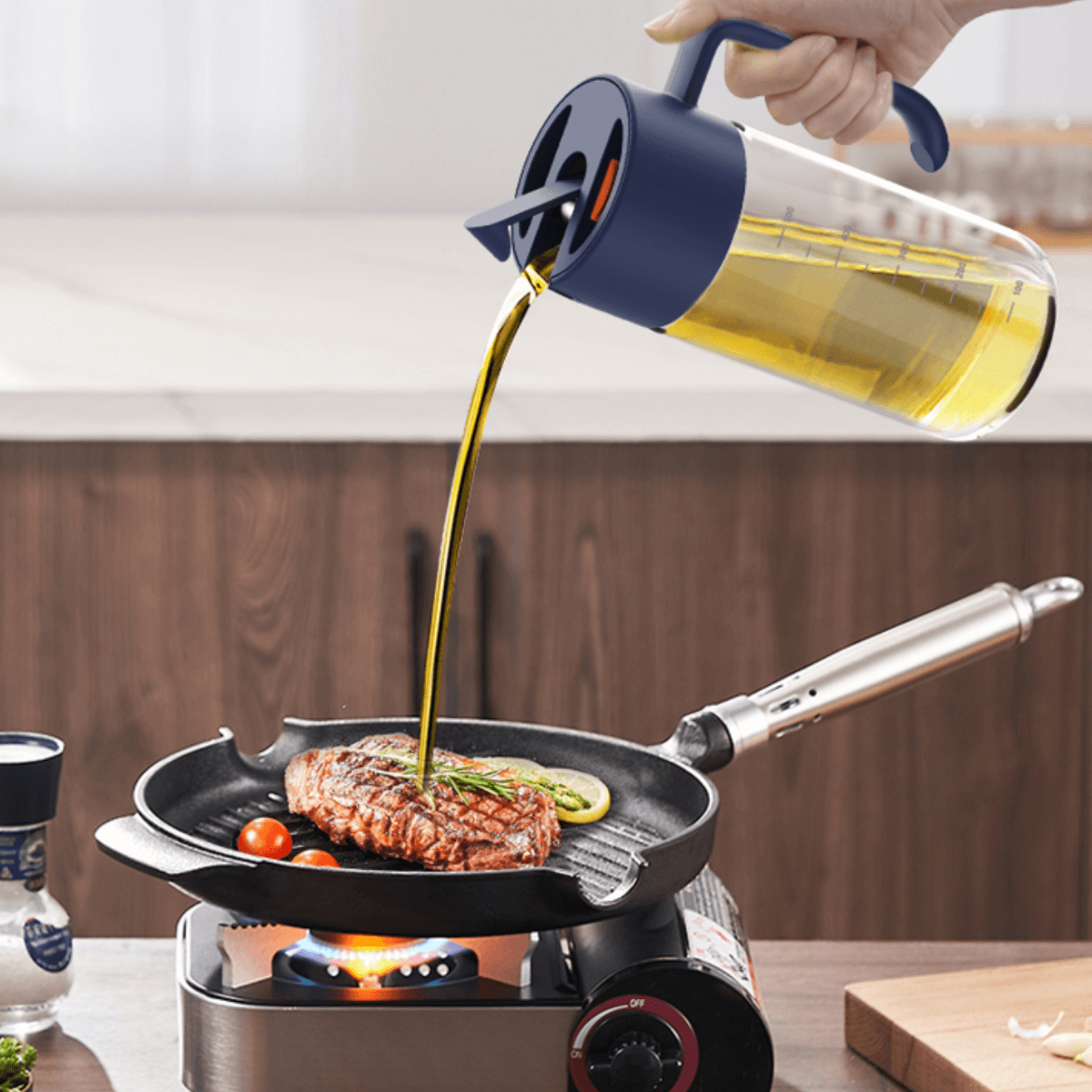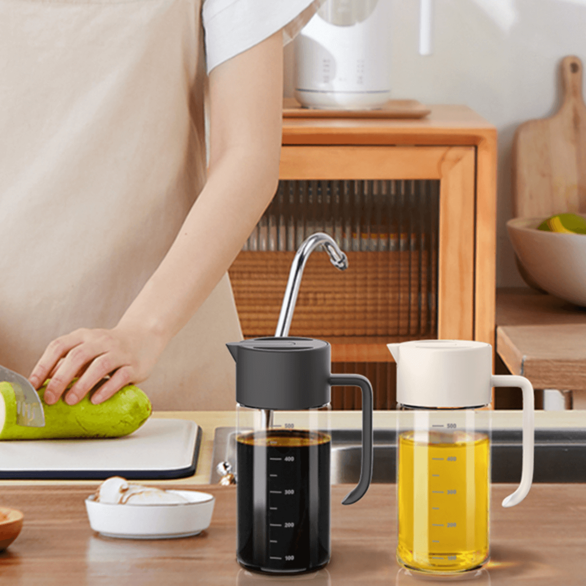 The Thinkinge Easy Open Self-Locking Oil Bottle features a spring-loaded snap-on cap design for easy access to the bottle's contents. No more struggling with stubborn caps. The self-locking cap is designed with a gravity flip cap that opens when tilted and closes when standing upright, ensuring easy one-handed pouring of oil without the need for thumb pressure. The leak-proof and drip-proof spout prevents water spills and keeps the kettle clean. This kettle has a large diameter and 18.5 oz capacity to minimize the risk of spillage when filled with liquid. Made from durable borosilicate glass, it is heat-resistant and dishwasher-safe, making cleanup a breeze. It is suitable for holding a wide range of cooking oils and features an automatic reflux function and non-stick design.