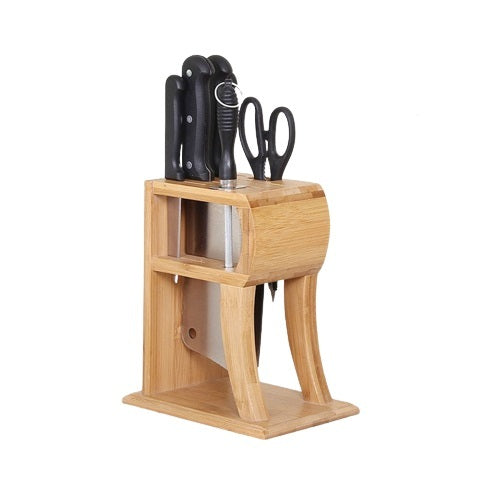 The THRJ R-Shape Bamboo Knife Holder is a great addition to any kitchen, saving your space. Keep your most frequently used kitchen knives in one place. Made of natural bamboo, which is tough and long-lasting. This product contains a rack only and does not contain any knives or scissors.