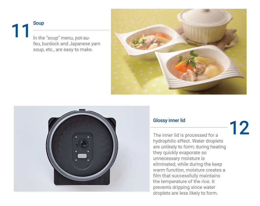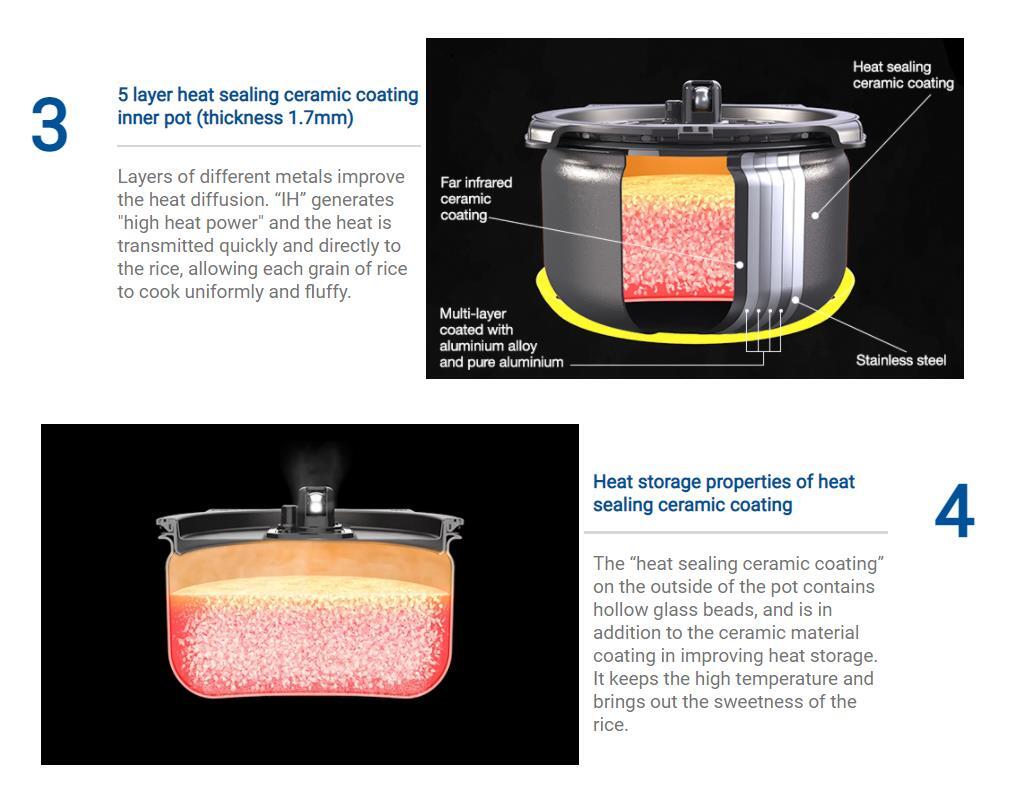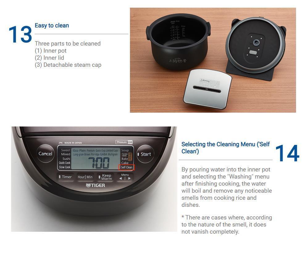 Enjoy delicious, fluffy rice with TIGER's "5 layer heat sealing ceramic coating inner pot" and its pressure technology. It also offers a variety of cooking menus for your meals by simply putting the ingredients into the rice cooker. It brings enjoyable meals to everyday living. This Tiger IH Pressure Rice Cooker has achieved delicious, fluffy rice with the development of the "5 layer heat sealing ceramic coating inner pot" and pressure IH technology. It enables to make daily meals delicious and convenient with shorter cooking hours or with the slow cooking menu.