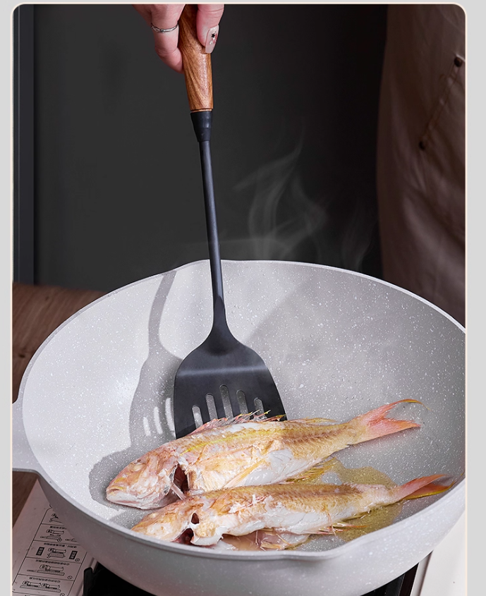 This Premium Iron Spatula combines durability and comfort with a matte-black iron head and a smooth golden rosewood handle. Measuring 40 cm, it provides extended reach for safe and easy flipping, stirring, and lifting during cooking. The slotted design helps drain excess oil or liquid, while the silicone-fit joint ensures a secure connection between handle and spatula head. A hanging hole allows convenient storage, making it a practical addition to any kitchen.