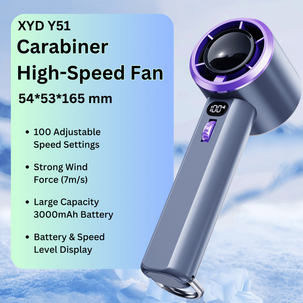 The Carabiner High-Speed Fan in gray offers powerful, customizable cooling with 100 adjustable speed levels, reaching an impressive wind speed of 7m/s. Equipped with a 3000mAh battery, it provides long-lasting airflow, and the display shows both the current speed setting and remaining battery life. Featuring advanced Turbo Cyclone Wind Technology, this fan delivers super-strong, concentrated airflow for maximum cooling. Its portable design includes a carabiner clip, making it easy to carry and perfect for outdoor activities, travel, or sports. Enjoy a powerful breeze wherever you go!