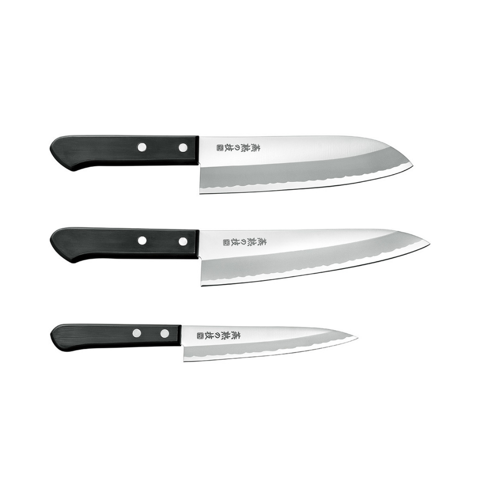 - Three high-quality knives with razor-sharp stainless steel blades.