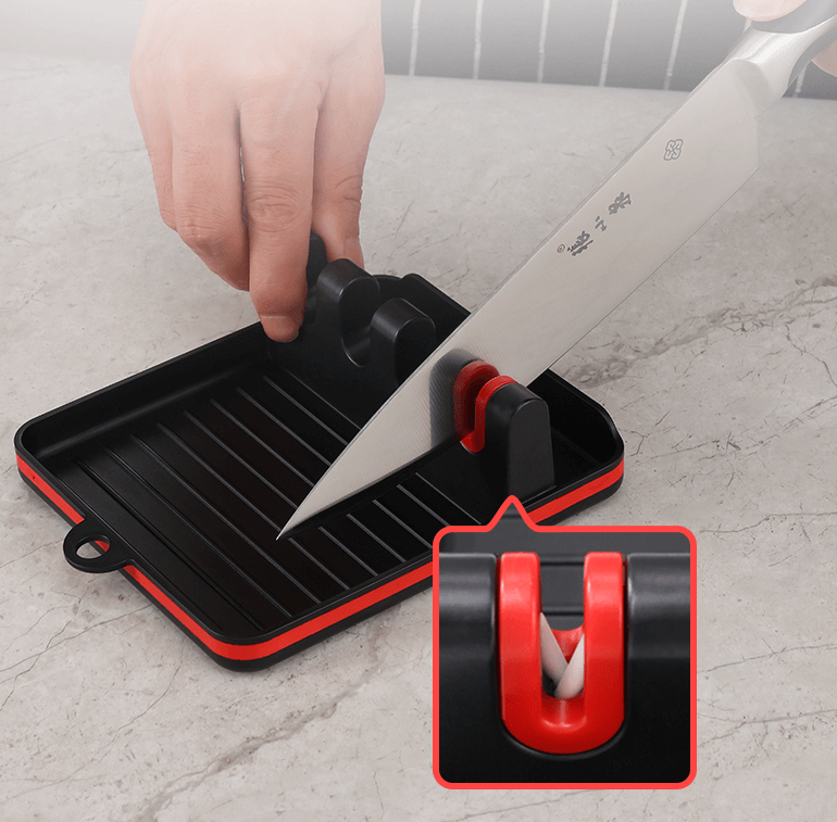 - This shelf has a compartment containing a knife sharpener